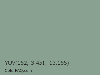 YUV 152,-3.451,-13.155 Color is a normal green color and the nearest color is Mantle #8b9c90. Hex code #89a191 and RGB value is rgb(137,161,145). In RGB color space, this color is composed of 54% red, 63% green, 57% blue, In CMYK color space, this color is composed of 15% cyan, 0% magenta, 10% yellow , 37% black , In HSL color space, this color has a hue angle of 140° , 11% saturation and 58% lightness.