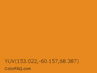 YUV 153.022,-60.157,68.387 Color is a normal orange color and the nearest color is Zest #e5841b. Hex code #e7891f and RGB value is rgb(231,137,31). In RGB color space, this color is composed of 91% red, 54% green, 12% blue, In CMYK color space, this color is composed of 0% cyan, 41% magenta, 87% yellow , 9% black , In HSL color space, this color has a hue angle of 32° , 81% saturation and 51% lightness.