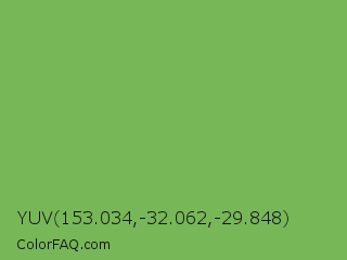 YUV 153.034,-32.062,-29.848 Color is a normal green color and the nearest color is Bud Green #7bb661. Hex code #77b758 and RGB value is rgb(119,183,88). In RGB color space, this color is composed of 47% red, 72% green, 35% blue, In CMYK color space, this color is composed of 35% cyan, 0% magenta, 52% yellow , 28% black , In HSL color space, this color has a hue angle of 100° , 40% saturation and 53% lightness.