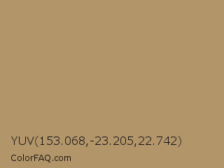 YUV 153.068,-23.205,22.742 Color is a normal orange color and the nearest color is Teak #b19461. Hex code #b3956a and RGB value is rgb(179,149,106). In RGB color space, this color is composed of 70% red, 58% green, 42% blue, In CMYK color space, this color is composed of 0% cyan, 17% magenta, 41% yellow , 30% black , In HSL color space, this color has a hue angle of 35° , 32% saturation and 56% lightness.