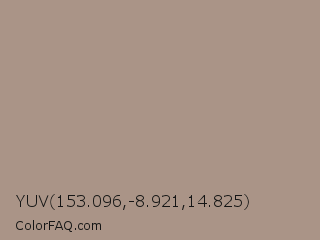 YUV 153.096,-8.921,14.825 Color is a normal orange color and the nearest color is Grullo #a99a86. Hex code #aa9487 and RGB value is rgb(170,148,135). In RGB color space, this color is composed of 67% red, 58% green, 53% blue, In CMYK color space, this color is composed of 0% cyan, 13% magenta, 21% yellow , 33% black , In HSL color space, this color has a hue angle of 22° , 17% saturation and 60% lightness.