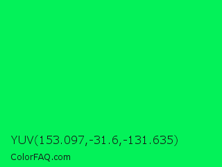 YUV 153.097,-31.6,-131.635 Color is a normal green color and the nearest color is Malachite #0bda51. Hex code #03f259 and RGB value is rgb(3,242,89). In RGB color space, this color is composed of 1% red, 95% green, 35% blue, In CMYK color space, this color is composed of 99% cyan, 0% magenta, 63% yellow , 5% black , In HSL color space, this color has a hue angle of 142° , 98% saturation and 48% lightness.