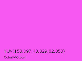 YUV 153.097,43.829,82.353 Color is a light magenta color and the nearest color is Pink Flamingo Crayola #ff66ff. Hex code #f758f2 and RGB value is rgb(247,88,242). In RGB color space, this color is composed of 97% red, 35% green, 95% blue, In CMYK color space, this color is composed of 0% cyan, 64% magenta, 2% yellow , 3% black , In HSL color space, this color has a hue angle of 302° , 91% saturation and 66% lightness.