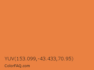 YUV 153.099,-43.433,70.95 Color is a normal orange color and the nearest color is Jaffa #ef863f. Hex code #ea8141 and RGB value is rgb(234,129,65). In RGB color space, this color is composed of 92% red, 51% green, 25% blue, In CMYK color space, this color is composed of 0% cyan, 45% magenta, 72% yellow , 8% black , In HSL color space, this color has a hue angle of 23° , 80% saturation and 59% lightness.