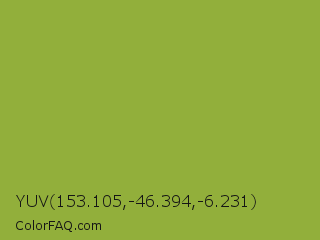 YUV 153.105,-46.394,-6.231 Color is a normal lime color and the nearest color is Sushi #87ab39. Hex code #92af3b and RGB value is rgb(146,175,59). In RGB color space, this color is composed of 57% red, 69% green, 23% blue, In CMYK color space, this color is composed of 17% cyan, 0% magenta, 66% yellow , 31% black , In HSL color space, this color has a hue angle of 75° , 50% saturation and 46% lightness.