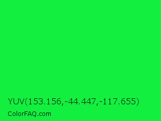 YUV 153.156,-44.447,-117.655 Color is a normal green color and the nearest color is Malachite #0bda51. Hex code #13ef3f and RGB value is rgb(19,239,63). In RGB color space, this color is composed of 7% red, 94% green, 25% blue, In CMYK color space, this color is composed of 92% cyan, 0% magenta, 74% yellow , 6% black , In HSL color space, this color has a hue angle of 132° , 87% saturation and 51% lightness.