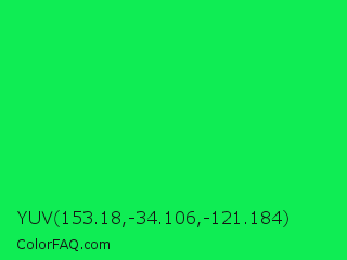 YUV 153.18,-34.106,-121.184 Color is a normal green color and the nearest color is Malachite #0bda51. Hex code #0fed54 and RGB value is rgb(15,237,84). In RGB color space, this color is composed of 6% red, 93% green, 33% blue, In CMYK color space, this color is composed of 94% cyan, 0% magenta, 65% yellow , 7% black , In HSL color space, this color has a hue angle of 139° , 88% saturation and 49% lightness.
