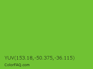 YUV 153.18,-50.375,-36.115 Color is a normal green color and the nearest color is Green RYB #66b032. Hex code #70c233 and RGB value is rgb(112,194,51). In RGB color space, this color is composed of 44% red, 76% green, 20% blue, In CMYK color space, this color is composed of 42% cyan, 0% magenta, 74% yellow , 24% black , In HSL color space, this color has a hue angle of 94° , 58% saturation and 48% lightness.