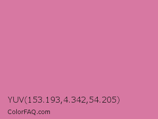 YUV 153.193,4.342,54.205 Color is a light rose color and the nearest color is Wild Orchid #d470a2. Hex code #d778a2 and RGB value is rgb(215,120,162). In RGB color space, this color is composed of 84% red, 47% green, 64% blue, In CMYK color space, this color is composed of 0% cyan, 44% magenta, 25% yellow , 16% black , In HSL color space, this color has a hue angle of 333° , 54% saturation and 66% lightness.