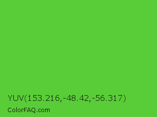 YUV 153.216,-48.42,-56.317 Color is a normal green color and the nearest color is Green RYB #66b032. Hex code #59cd37 and RGB value is rgb(89,205,55). In RGB color space, this color is composed of 35% red, 80% green, 22% blue, In CMYK color space, this color is composed of 57% cyan, 0% magenta, 73% yellow , 20% black , In HSL color space, this color has a hue angle of 106° , 60% saturation and 51% lightness.