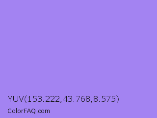 YUV 153.222,43.768,8.575 Color is a light indigo color and the nearest color is Dull Lavender #a899e6. Hex code #a383f2 and RGB value is rgb(163,131,242). In RGB color space, this color is composed of 64% red, 51% green, 95% blue, In CMYK color space, this color is composed of 33% cyan, 46% magenta, 0% yellow , 5% black , In HSL color space, this color has a hue angle of 257° , 81% saturation and 73% lightness.