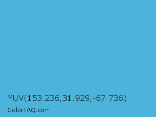 YUV 153.236,31.929,-67.736 Color is a normal blue color and the nearest color is Shakespeare #4eabd1. Hex code #4cb4da and RGB value is rgb(76,180,218). In RGB color space, this color is composed of 30% red, 71% green, 85% blue, In CMYK color space, this color is composed of 65% cyan, 17% magenta, 0% yellow , 15% black , In HSL color space, this color has a hue angle of 196° , 66% saturation and 58% lightness.
