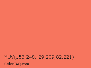 YUV 153.248,-29.209,82.221 Color is a light red color and the nearest color is Bittersweet #fe6f5e. Hex code #f7755e and RGB value is rgb(247,117,94). In RGB color space, this color is composed of 97% red, 46% green, 37% blue, In CMYK color space, this color is composed of 0% cyan, 53% magenta, 62% yellow , 3% black , In HSL color space, this color has a hue angle of 9° , 91% saturation and 67% lightness.