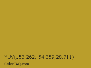 YUV 153.262,-54.359,28.711 Color is a normal yellow color and the nearest color is Nugget #c59922. Hex code #ba9e2b and RGB value is rgb(186,158,43). In RGB color space, this color is composed of 73% red, 62% green, 17% blue, In CMYK color space, this color is composed of 0% cyan, 15% magenta, 77% yellow , 27% black , In HSL color space, this color has a hue angle of 48° , 62% saturation and 45% lightness.