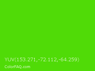 YUV 153.271,-72.112,-64.259 Color is a normal green color and the nearest color is Harlequin Green #46cb18. Hex code #50db07 and RGB value is rgb(80,219,7). In RGB color space, this color is composed of 31% red, 86% green, 3% blue, In CMYK color space, this color is composed of 63% cyan, 0% magenta, 97% yellow , 14% black , In HSL color space, this color has a hue angle of 99° , 94% saturation and 44% lightness.