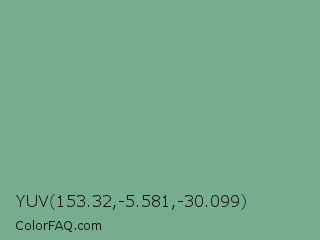 YUV 153.32,-5.581,-30.099 Color is a normal green color and the nearest color is Bay Leaf #7da98d. Hex code #77ad8e and RGB value is rgb(119,173,142). In RGB color space, this color is composed of 47% red, 68% green, 56% blue, In CMYK color space, this color is composed of 31% cyan, 0% magenta, 18% yellow , 32% black , In HSL color space, this color has a hue angle of 146° , 25% saturation and 57% lightness.