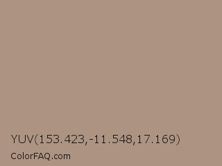 YUV 153.423,-11.548,17.169 Color is a normal orange color and the nearest color is Grullo #a99a86. Hex code #ad9482 and RGB value is rgb(173,148,130). In RGB color space, this color is composed of 68% red, 58% green, 51% blue, In CMYK color space, this color is composed of 0% cyan, 14% magenta, 25% yellow , 32% black , In HSL color space, this color has a hue angle of 25° , 21% saturation and 59% lightness.