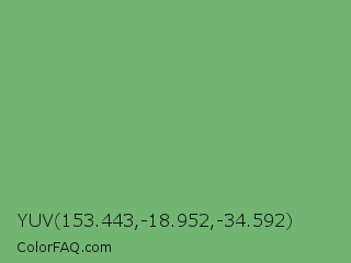 YUV 153.443,-18.952,-34.592 Color is a normal green color and the nearest color is Iguana Green #71bc78. Hex code #72b573 and RGB value is rgb(114,181,115). In RGB color space, this color is composed of 45% red, 71% green, 45% blue, In CMYK color space, this color is composed of 37% cyan, 0% magenta, 36% yellow , 29% black , In HSL color space, this color has a hue angle of 121° , 31% saturation and 58% lightness.