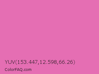 YUV 153.447,12.598,66.26 Color is a light magenta color and the nearest color is Thulian Pink #de6fa1. Hex code #e56eb3 and RGB value is rgb(229,110,179). In RGB color space, this color is composed of 90% red, 43% green, 70% blue, In CMYK color space, this color is composed of 0% cyan, 52% magenta, 22% yellow , 10% black , In HSL color space, this color has a hue angle of 325° , 70% saturation and 66% lightness.