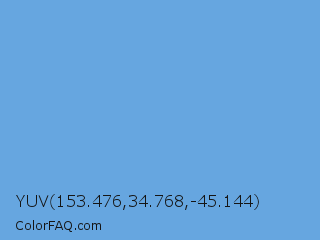 YUV 153.476,34.768,-45.144 Color is a light blue color and the nearest color is Little Boy Blue #6ca0dc. Hex code #66a6e0 and RGB value is rgb(102,166,224). In RGB color space, this color is composed of 40% red, 65% green, 88% blue, In CMYK color space, this color is composed of 54% cyan, 26% magenta, 0% yellow , 12% black , In HSL color space, this color has a hue angle of 209° , 66% saturation and 64% lightness.