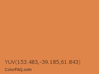 YUV 153.483,-39.185,61.843 Color is a normal orange color and the nearest color is Tigers Eye #e08d3c. Hex code #e0854a and RGB value is rgb(224,133,74). In RGB color space, this color is composed of 88% red, 52% green, 29% blue, In CMYK color space, this color is composed of 0% cyan, 41% magenta, 67% yellow , 12% black , In HSL color space, this color has a hue angle of 24° , 71% saturation and 58% lightness.
