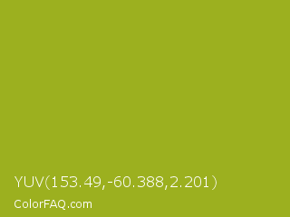 YUV 153.49,-60.388,2.201 Color is a normal yellow color and the nearest color is Citron #9fa91f. Hex code #9cb01f and RGB value is rgb(156,176,31). In RGB color space, this color is composed of 61% red, 69% green, 12% blue, In CMYK color space, this color is composed of 11% cyan, 0% magenta, 82% yellow , 31% black , In HSL color space, this color has a hue angle of 68° , 70% saturation and 41% lightness.