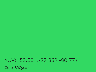 YUV 153.501,-27.362,-90.77 Color is a normal green color and the nearest color is UFO Green #3cd070. Hex code #32d962 and RGB value is rgb(50,217,98). In RGB color space, this color is composed of 20% red, 85% green, 38% blue, In CMYK color space, this color is composed of 77% cyan, 0% magenta, 55% yellow , 15% black , In HSL color space, this color has a hue angle of 137° , 69% saturation and 52% lightness.