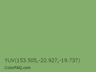 YUV 153.505,-22.927,-19.737 Color is a normal green color and the nearest color is Asparagus #87a96b. Hex code #83ae6b and RGB value is rgb(131,174,107). In RGB color space, this color is composed of 51% red, 68% green, 42% blue, In CMYK color space, this color is composed of 25% cyan, 0% magenta, 39% yellow , 32% black , In HSL color space, this color has a hue angle of 99° , 29% saturation and 55% lightness.