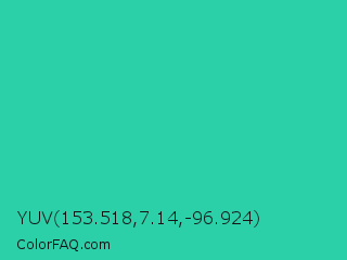 YUV 153.518,7.14,-96.924 Color is a normal cyan color and the nearest color is Shamrock #33cc99. Hex code #2bcfa8 and RGB value is rgb(43,207,168). In RGB color space, this color is composed of 17% red, 81% green, 66% blue, In CMYK color space, this color is composed of 79% cyan, 0% magenta, 19% yellow , 19% black , In HSL color space, this color has a hue angle of 166° , 66% saturation and 49% lightness.