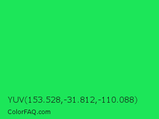 YUV 153.528,-31.812,-110.088 Color is a normal green color and the nearest color is Malachite #0bda51. Hex code #1ce659 and RGB value is rgb(28,230,89). In RGB color space, this color is composed of 11% red, 90% green, 35% blue, In CMYK color space, this color is composed of 88% cyan, 0% magenta, 61% yellow , 10% black , In HSL color space, this color has a hue angle of 138° , 80% saturation and 51% lightness.