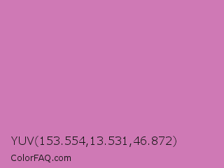 YUV 153.554,13.531,46.872 Color is a light magenta color and the nearest color is Sky Magenta #cf71af. Hex code #cf79b5 and RGB value is rgb(207,121,181). In RGB color space, this color is composed of 81% red, 47% green, 71% blue, In CMYK color space, this color is composed of 0% cyan, 42% magenta, 13% yellow , 19% black , In HSL color space, this color has a hue angle of 318° , 47% saturation and 64% lightness.