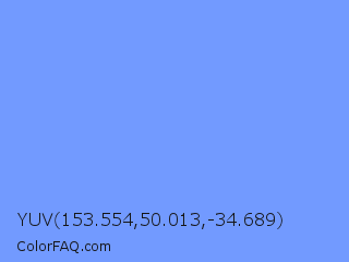 YUV 153.554,50.013,-34.689 Color is a light blue color and the nearest color is Cornflower Blue #6495ed. Hex code #729aff and RGB value is rgb(114,154,255). In RGB color space, this color is composed of 45% red, 60% green, 100% blue, In CMYK color space, this color is composed of 55% cyan, 40% magenta, 0% yellow , 0% black , In HSL color space, this color has a hue angle of 223° , 100% saturation and 72% lightness.