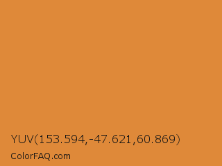 YUV 153.594,-47.621,60.869 Color is a normal orange color and the nearest color is Tigers Eye #e08d3c. Hex code #df8939 and RGB value is rgb(223,137,57). In RGB color space, this color is composed of 87% red, 54% green, 22% blue, In CMYK color space, this color is composed of 0% cyan, 39% magenta, 74% yellow , 13% black , In HSL color space, this color has a hue angle of 29° , 72% saturation and 55% lightness.