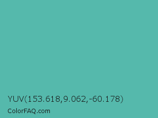 YUV 153.618,9.062,-60.178 Color is a normal cyan color and the nearest color is Tradewind #5fb3ac. Hex code #55b9ac and RGB value is rgb(85,185,172). In RGB color space, this color is composed of 33% red, 73% green, 67% blue, In CMYK color space, this color is composed of 54% cyan, 0% magenta, 7% yellow , 27% black , In HSL color space, this color has a hue angle of 172° , 42% saturation and 53% lightness.