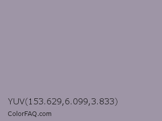 YUV 153.629,6.099,3.833 Color is a light purple color and the nearest color is Manatee #979aaa. Hex code #9e95a6 and RGB value is rgb(158,149,166). In RGB color space, this color is composed of 62% red, 58% green, 65% blue, In CMYK color space, this color is composed of 5% cyan, 10% magenta, 0% yellow , 35% black , In HSL color space, this color has a hue angle of 272° , 9% saturation and 62% lightness.