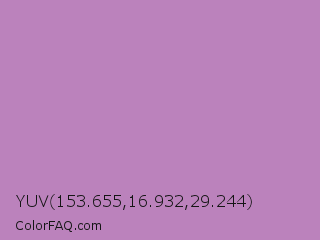 YUV 153.655,16.932,29.244 Color is a light magenta color and the nearest color is African Violet #b284be. Hex code #bb82bc and RGB value is rgb(187,130,188). In RGB color space, this color is composed of 73% red, 51% green, 74% blue, In CMYK color space, this color is composed of 1% cyan, 31% magenta, 0% yellow , 26% black , In HSL color space, this color has a hue angle of 299° , 30% saturation and 62% lightness.