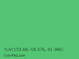 YUV 153.68,-18.576,-61.986 Color is a normal green color and the nearest color is Emerald #50c878. Hex code #53c574 and RGB value is rgb(83,197,116). In RGB color space, this color is composed of 33% red, 77% green, 45% blue, In CMYK color space, this color is composed of 58% cyan, 0% magenta, 41% yellow , 23% black , In HSL color space, this color has a hue angle of 137° , 50% saturation and 55% lightness.