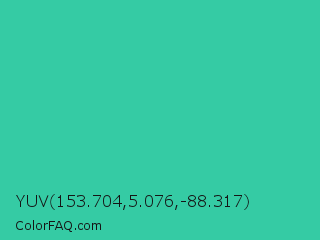 YUV 153.704,5.076,-88.317 Color is a normal cyan color and the nearest color is Shamrock #33cc99. Hex code #35cba4 and RGB value is rgb(53,203,164). In RGB color space, this color is composed of 21% red, 80% green, 64% blue, In CMYK color space, this color is composed of 74% cyan, 0% magenta, 19% yellow , 20% black , In HSL color space, this color has a hue angle of 164° , 59% saturation and 50% lightness.