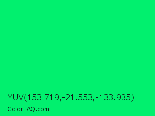 YUV 153.719,-21.553,-133.935 Color is a normal green color and the nearest color is Spring Green #00ff7f. Hex code #01f06e and RGB value is rgb(1,240,110). In RGB color space, this color is composed of 0% red, 94% green, 43% blue, In CMYK color space, this color is composed of 100% cyan, 0% magenta, 54% yellow , 6% black , In HSL color space, this color has a hue angle of 147° , 99% saturation and 47% lightness.