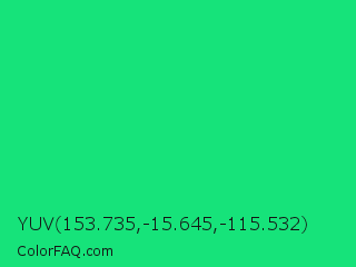 YUV 153.735,-15.645,-115.532 Color is a normal green color and the nearest color is Spring Green #00ff7f. Hex code #16e37a and RGB value is rgb(22,227,122). In RGB color space, this color is composed of 9% red, 89% green, 48% blue, In CMYK color space, this color is composed of 90% cyan, 0% magenta, 46% yellow , 11% black , In HSL color space, this color has a hue angle of 149° , 82% saturation and 49% lightness.