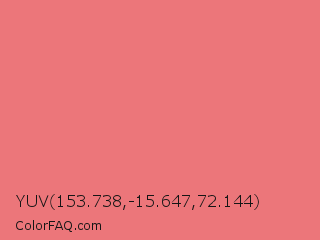 YUV 153.738,-15.647,72.144 Color is a light red color and the nearest color is Candy Pink #e4717a. Hex code #ec767a and RGB value is rgb(236,118,122). In RGB color space, this color is composed of 93% red, 46% green, 48% blue, In CMYK color space, this color is composed of 0% cyan, 50% magenta, 48% yellow , 7% black , In HSL color space, this color has a hue angle of 358° , 76% saturation and 69% lightness.