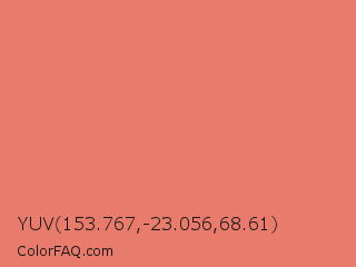 YUV 153.767,-23.056,68.61 Color is a light red color and the nearest color is Japonica #d87c63. Hex code #e87b6b and RGB value is rgb(232,123,107). In RGB color space, this color is composed of 91% red, 48% green, 42% blue, In CMYK color space, this color is composed of 0% cyan, 47% magenta, 54% yellow , 9% black , In HSL color space, this color has a hue angle of 8° , 73% saturation and 66% lightness.