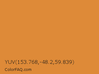 YUV 153.768,-48.2,59.839 Color is a normal orange color and the nearest color is Tigers Eye #e08d3c. Hex code #de8a38 and RGB value is rgb(222,138,56). In RGB color space, this color is composed of 87% red, 54% green, 22% blue, In CMYK color space, this color is composed of 0% cyan, 38% magenta, 75% yellow , 13% black , In HSL color space, this color has a hue angle of 30° , 72% saturation and 55% lightness.