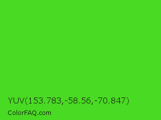 YUV 153.783,-58.56,-70.847 Color is a normal green color and the nearest color is Harlequin Green #46cb18. Hex code #49da23 and RGB value is rgb(73,218,35). In RGB color space, this color is composed of 29% red, 85% green, 14% blue, In CMYK color space, this color is composed of 67% cyan, 0% magenta, 84% yellow , 15% black , In HSL color space, this color has a hue angle of 108° , 72% saturation and 50% lightness.