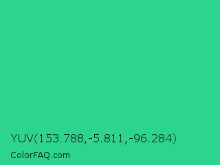 YUV 153.788,-5.811,-96.284 Color is a normal green color and the nearest color is Shamrock #33cc99. Hex code #2cd48e and RGB value is rgb(44,212,142). In RGB color space, this color is composed of 17% red, 83% green, 56% blue, In CMYK color space, this color is composed of 79% cyan, 0% magenta, 33% yellow , 17% black , In HSL color space, this color has a hue angle of 155° , 66% saturation and 50% lightness.