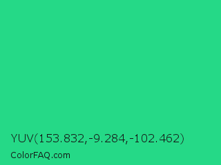 YUV 153.832,-9.284,-102.462 Color is a normal green color and the nearest color is Shamrock #33cc99. Hex code #25d987 and RGB value is rgb(37,217,135). In RGB color space, this color is composed of 15% red, 85% green, 53% blue, In CMYK color space, this color is composed of 83% cyan, 0% magenta, 38% yellow , 15% black , In HSL color space, this color has a hue angle of 153° , 71% saturation and 50% lightness.