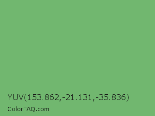 YUV 153.862,-21.131,-35.836 Color is a normal green color and the nearest color is Iguana Green #71bc78. Hex code #71b76f and RGB value is rgb(113,183,111). In RGB color space, this color is composed of 44% red, 72% green, 44% blue, In CMYK color space, this color is composed of 38% cyan, 0% magenta, 39% yellow , 28% black , In HSL color space, this color has a hue angle of 118° , 33% saturation and 58% lightness.