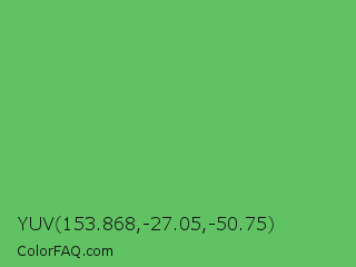 YUV 153.868,-27.05,-50.75 Color is a normal green color and the nearest color is Fern #63b76c. Hex code #60c263 and RGB value is rgb(96,194,99). In RGB color space, this color is composed of 38% red, 76% green, 39% blue, In CMYK color space, this color is composed of 51% cyan, 0% magenta, 49% yellow , 24% black , In HSL color space, this color has a hue angle of 122° , 45% saturation and 57% lightness.