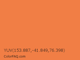 YUV 153.887,-41.849,76.398 Color is a light orange color and the nearest color is Mandarin #f37a48. Hex code #f17e45 and RGB value is rgb(241,126,69). In RGB color space, this color is composed of 95% red, 49% green, 27% blue, In CMYK color space, this color is composed of 0% cyan, 48% magenta, 71% yellow , 5% black , In HSL color space, this color has a hue angle of 20° , 86% saturation and 61% lightness.