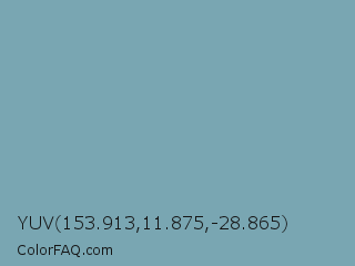 YUV 153.913,11.875,-28.865 Color is a normal cyan color and the nearest color is Gumbo #7ca1a6. Hex code #79a6b2 and RGB value is rgb(121,166,178). In RGB color space, this color is composed of 47% red, 65% green, 70% blue, In CMYK color space, this color is composed of 32% cyan, 7% magenta, 0% yellow , 30% black , In HSL color space, this color has a hue angle of 193° , 27% saturation and 59% lightness.